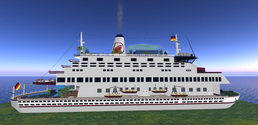 Großzügige Decks, feine Holzelemente, weiche Rundungen, klare Linien und ein unverwechselbarer maritimer Stil – die MS Deutschland wirkt wie ein echtes, lebendiges Luxusliner-Modell im Metaverse.